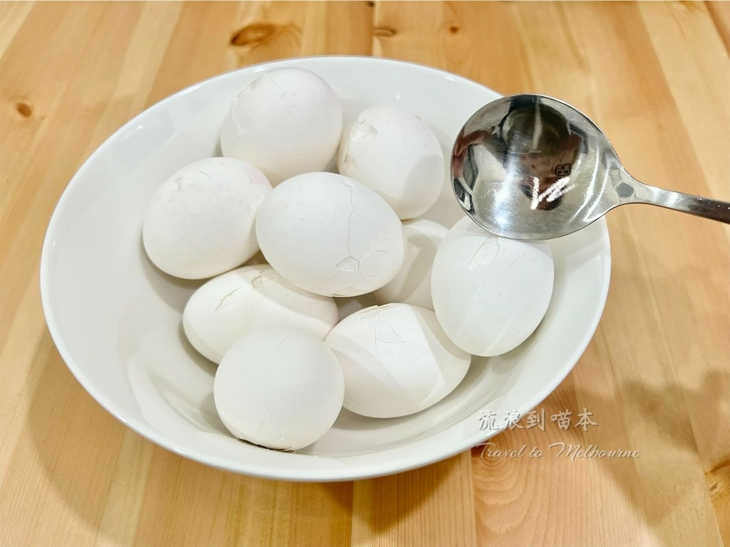 ➊將雞蛋先水煮熟後,用湯匙輕敲出裂痕。