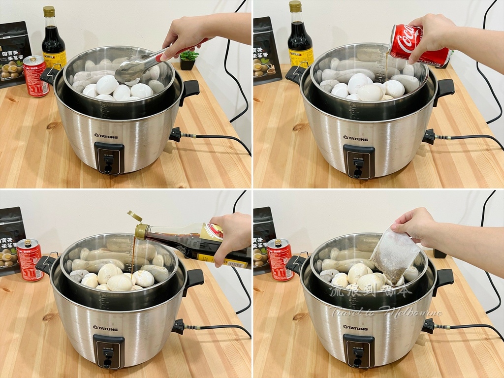 ➋將雞蛋放入電鍋內鍋,並加入滷包、醬油、可樂(醬油與可樂的量視個人口味做調整)。