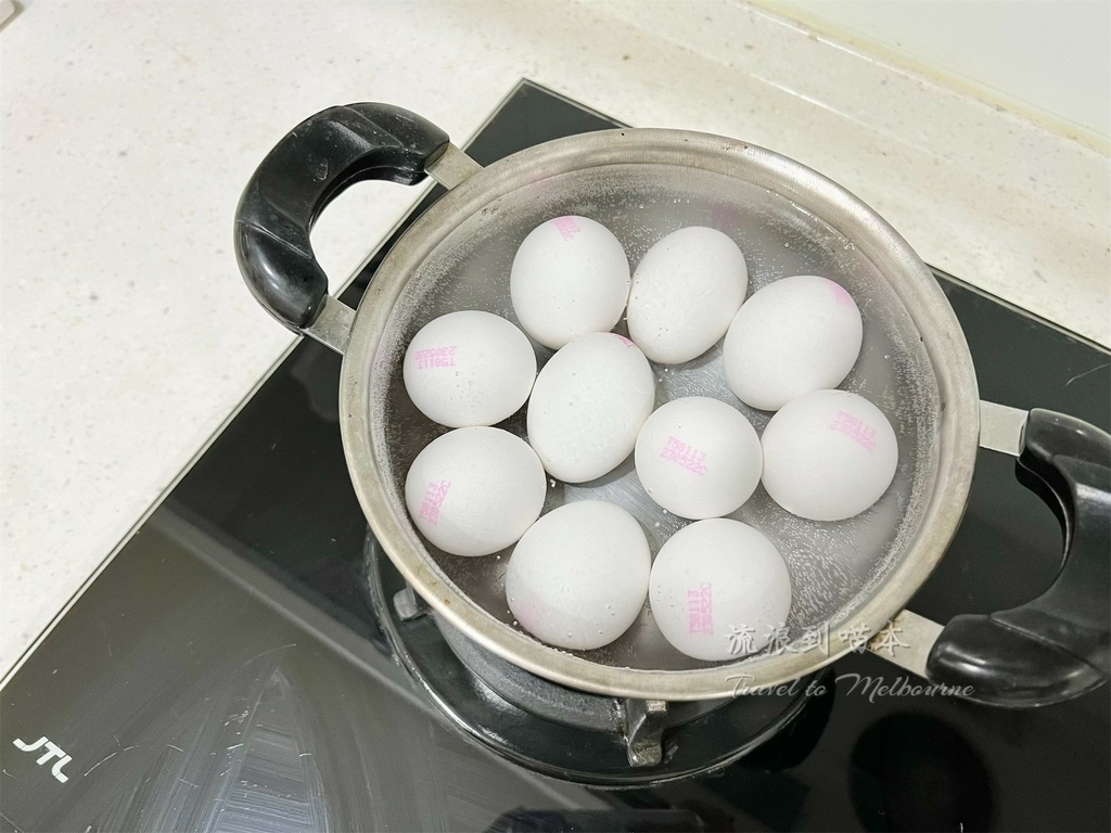 ➌加入足量的水淹過雞蛋,電鍋外鍋加入2米杯的水,開啟炊煮。